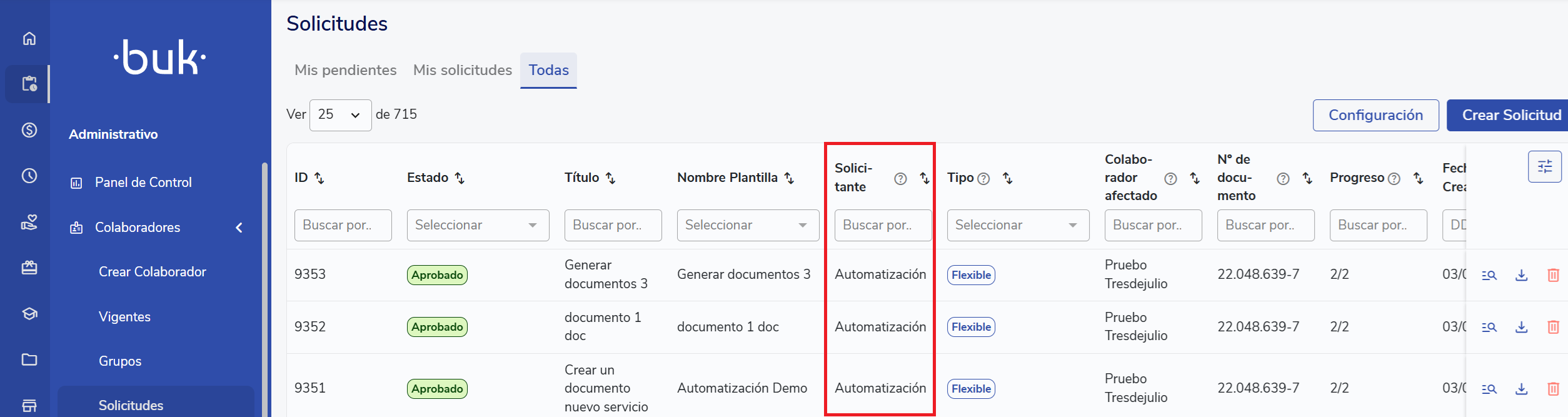 En la vista de solicitudes, bajo el tab de "Todas" en la columna Solicitante verás un "Automatización" cuando la solicitud es de ese tipo. Recuerda que también puedes habilitar esta columna si es que está oculta.