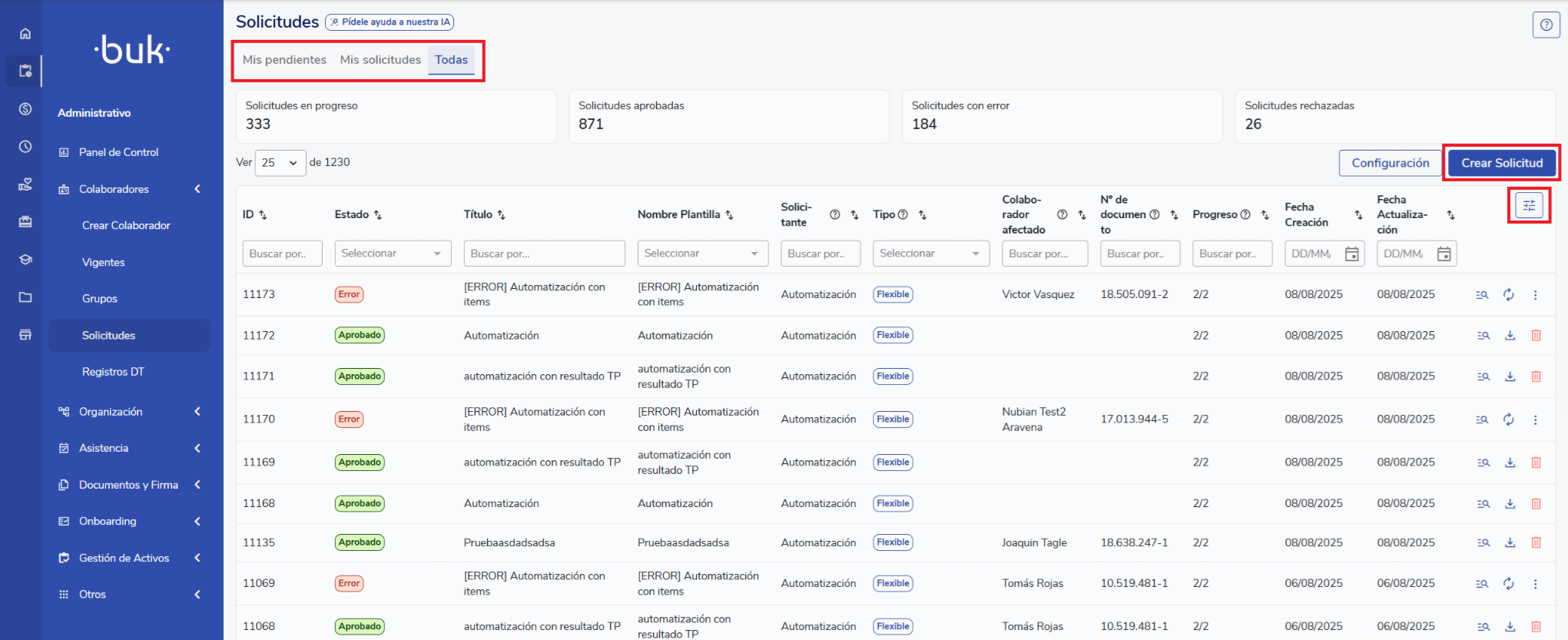Todas: Todas las solicitudes de la plataforma (disponible solo para perfiles con permiso de Modificación o Lectura) y sus estadísticas.