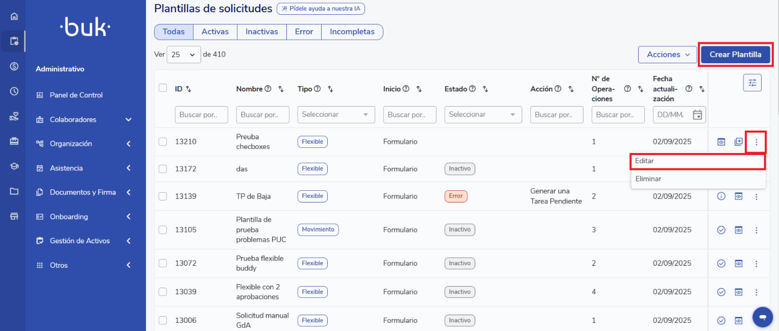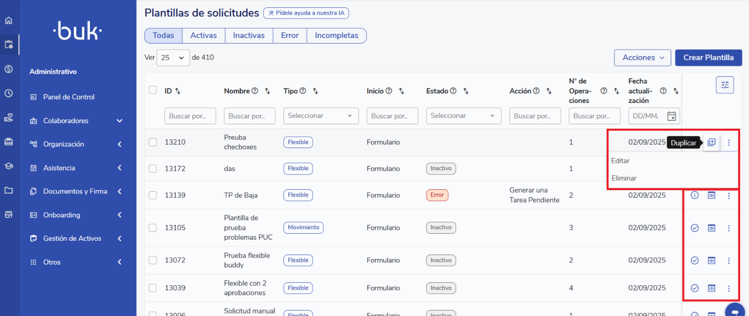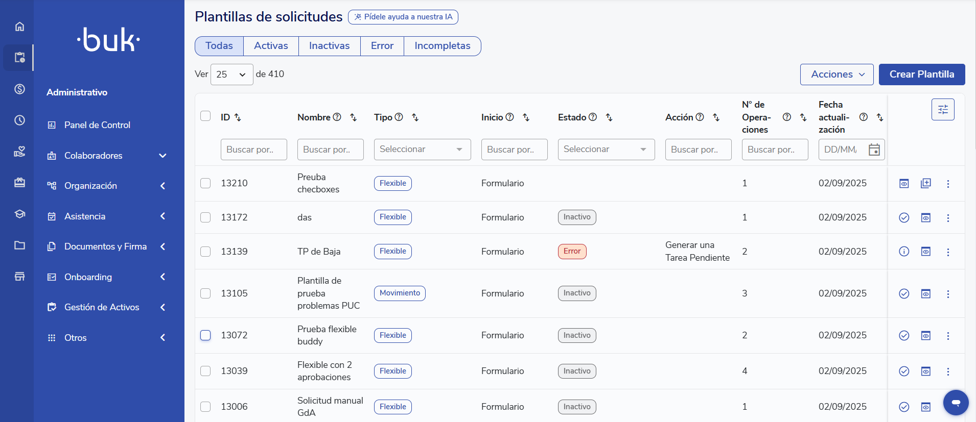 Para acceder, haz clic en el botón de Configuración en la esquina superior derecha de la vista de Solicitudes. Esta vista permite administrar todas las plantillas disponibles en la plataforma.