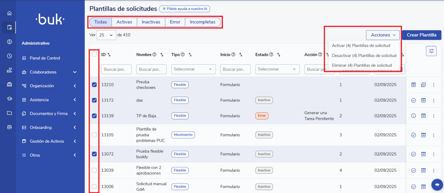 En la esquina superior izquierda, veras las siguientes opciones de acciones masivas: