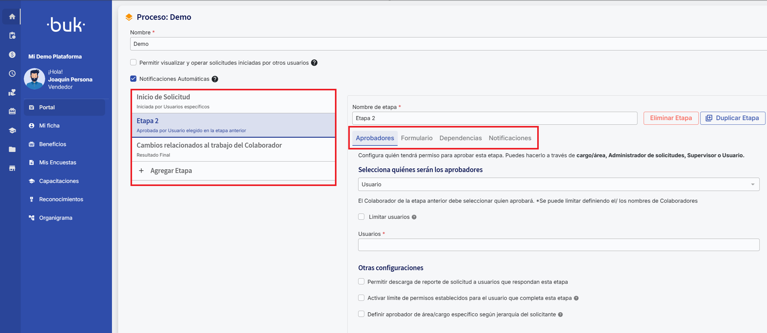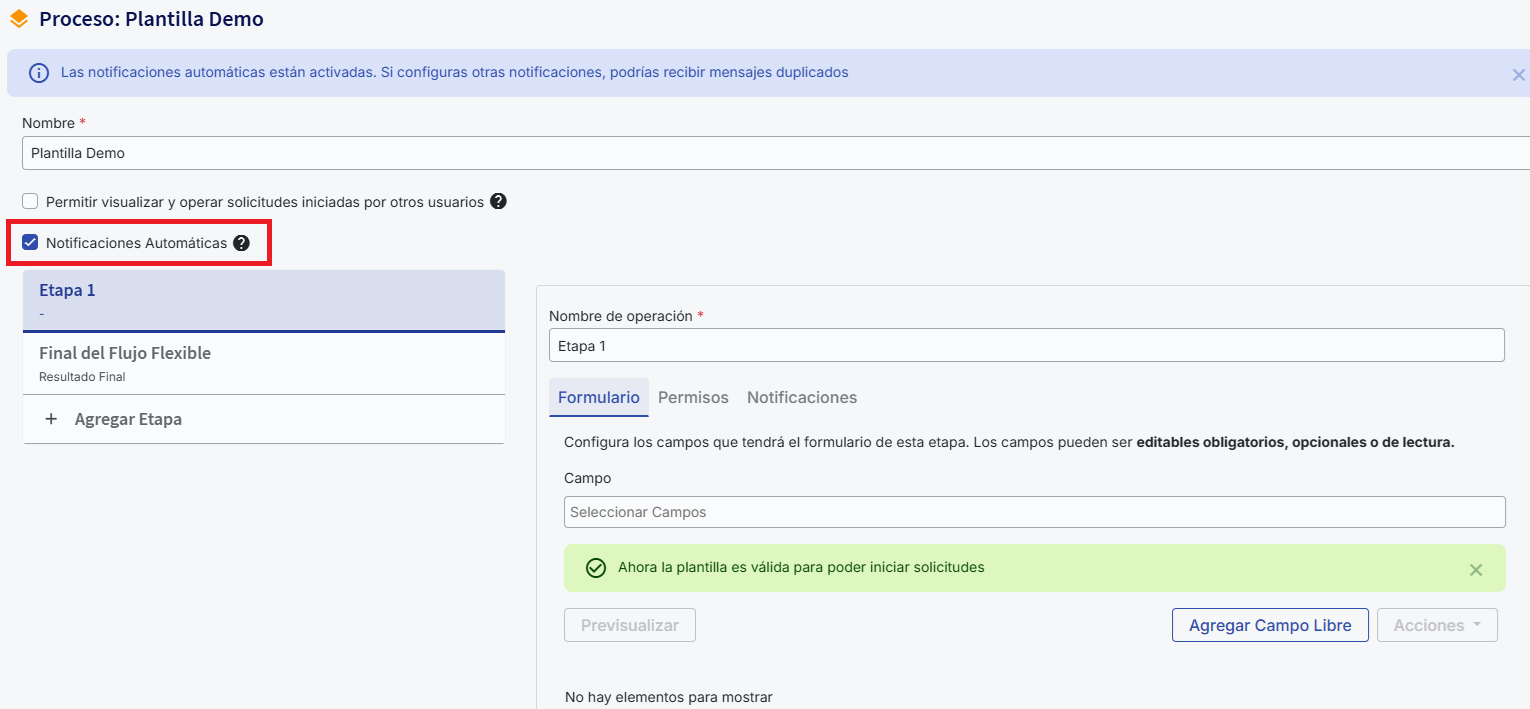Si habilitas notificaciones automáticas, se enviarán notificaciones a todos los usuarios asignados en la pestaña "Permisos" de cada etapa.