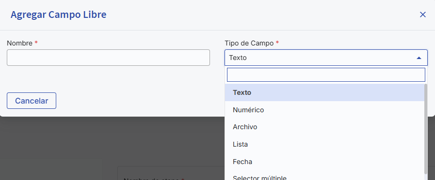 Puedes seleccionar campos desde el listado asociado al tipo de flujo o agregar campos libres personalizados (de tipo texto, numérico, archivo, lista, fecha o selección múltiple).
