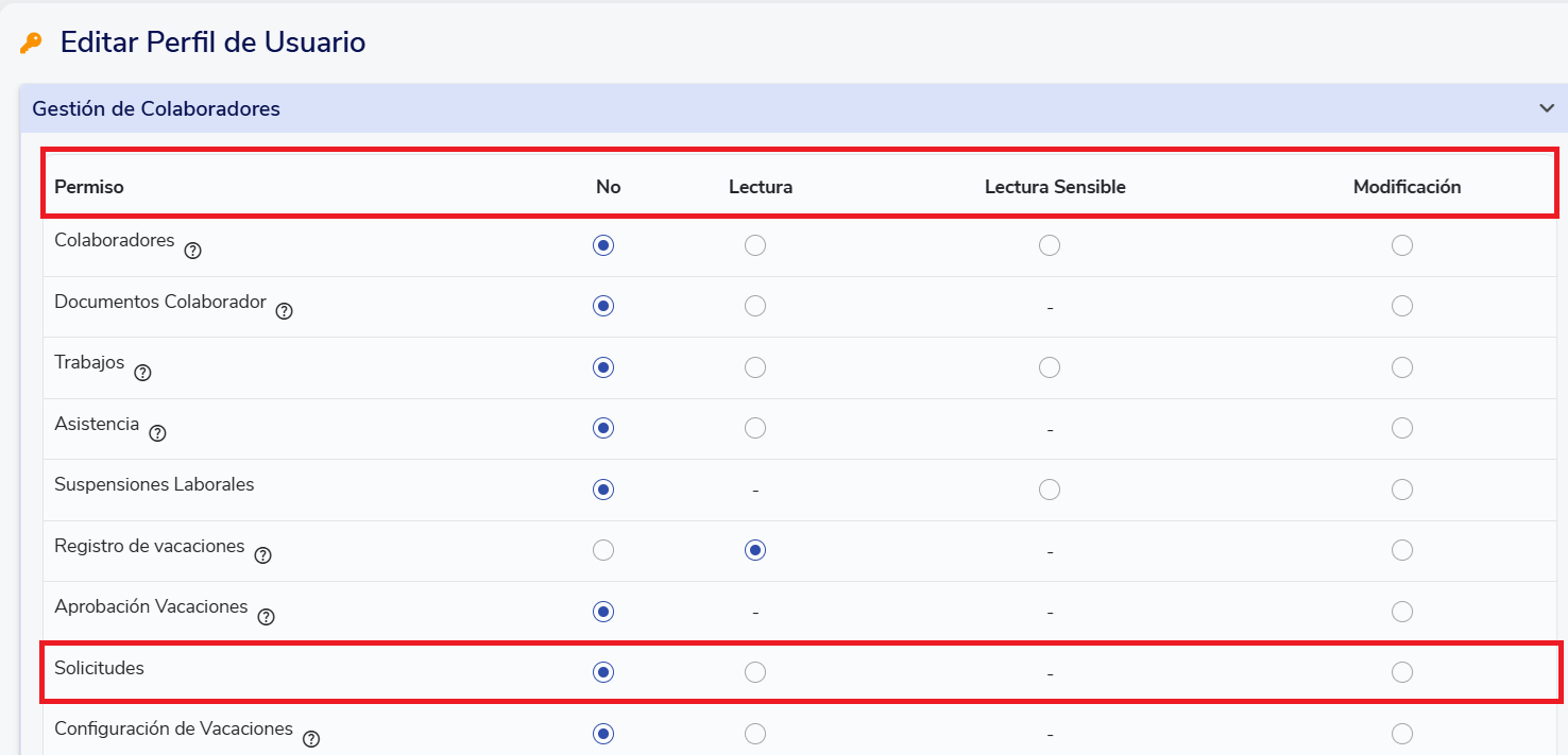 Existen tres niveles de permiso para el módulo de Solicitudes: