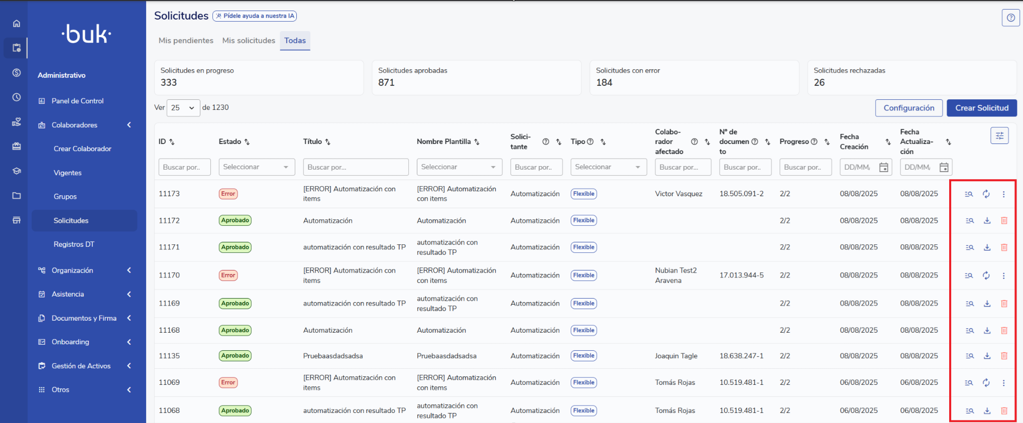 Nota*: Anteriormente, el acceso era desde Colaboradores > Solicitudes, por lo que algunas imágenes pueden reflejar eso. Ese acceso aún está disponible, pero pre filtrado para solamente mostrar solicitudes de Alta, Movimiento, Baja, Búsqueda y Pre-Ingreso.