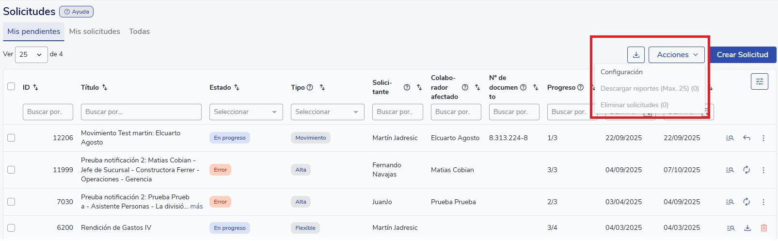 - Eliminar solicitudes: Elimina todas las solicitudes seleccionadas.