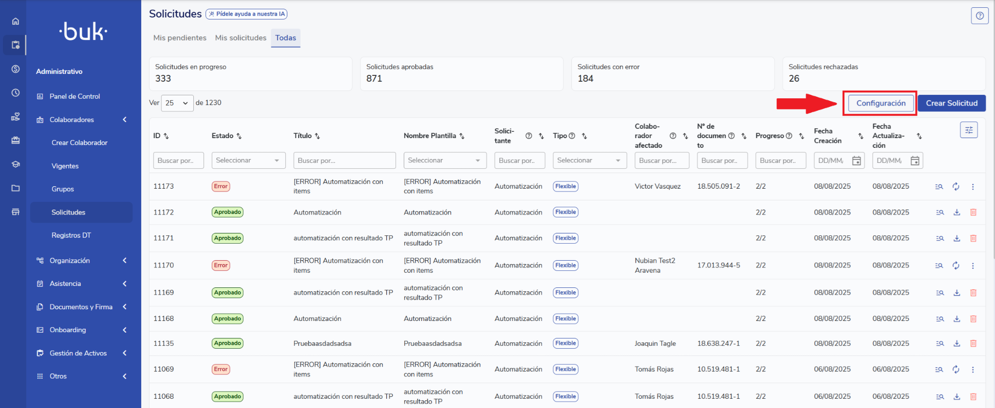 - Accede a Administrativo > Colaboradores > Solicitudes > Configuración.