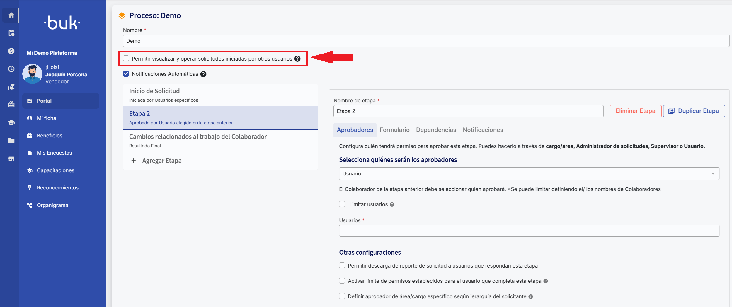 Al activarla, todos los colaboradores podrán ver las solicitudes iniciadas por otros. Sin embargo, solo podrán completar la primera operación si su área y cargo coinciden con los permisos definidos para esa etapa. Esta funcionalidad es útil cuando quieres otorgar visibilidad general sin comprometer la lógica de permisos establecida.