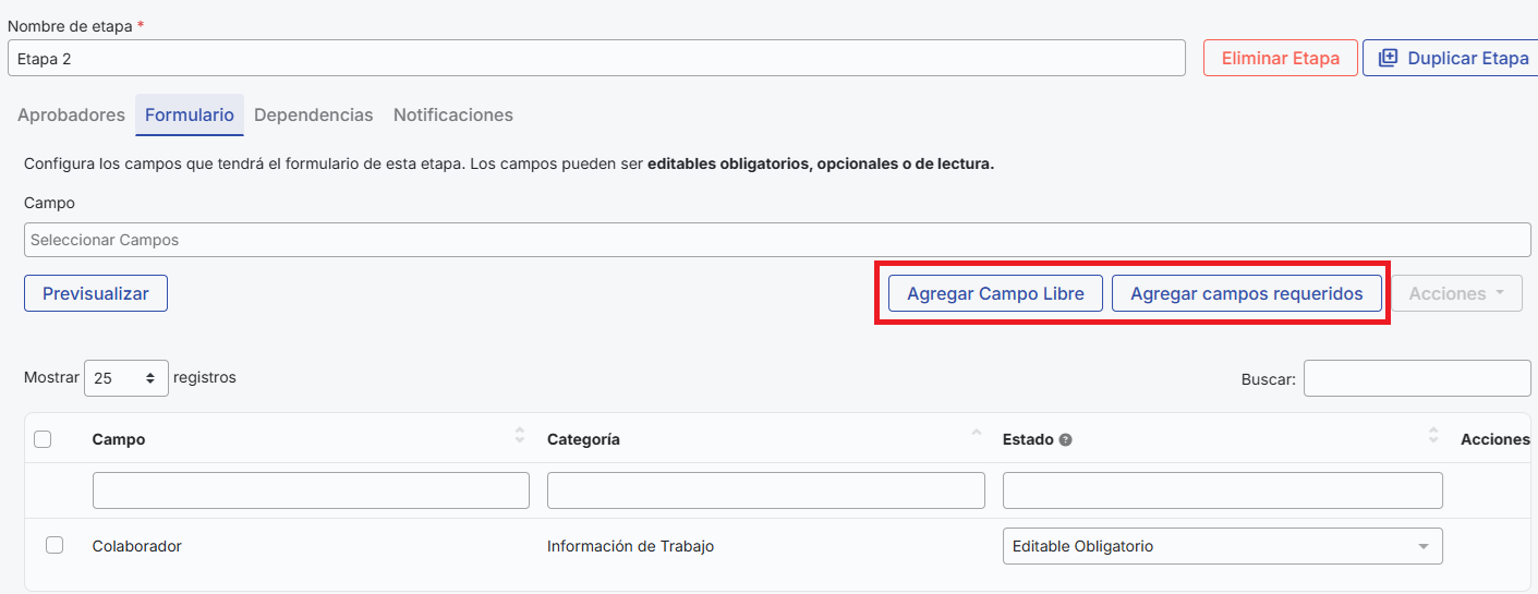 - Una vez configurados los campos, deberás indicar su estado en cada etapa. Algunos ya vendrán marcados como obligatorios por defecto.
