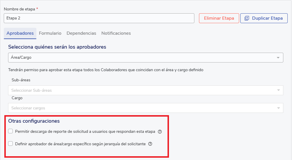 - Definir aprobador de área/cargo específico, con la finalidad de que la jefatura que pueda aprobar esta etapa corresponda al supervisor del solicitante.
