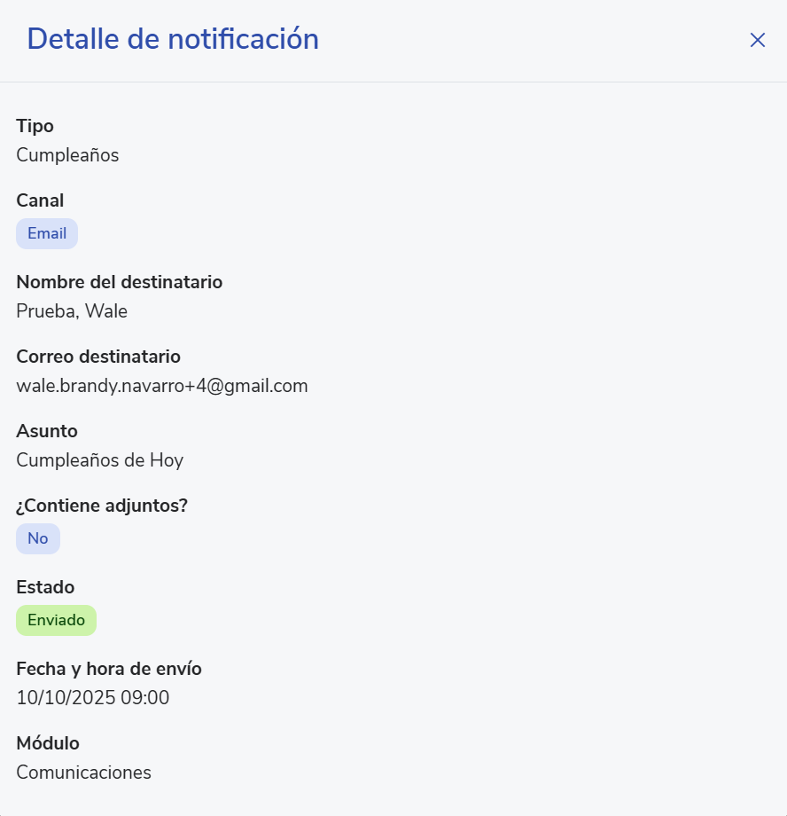 - Nombre del destinatario: Persona que recibió la notificación.