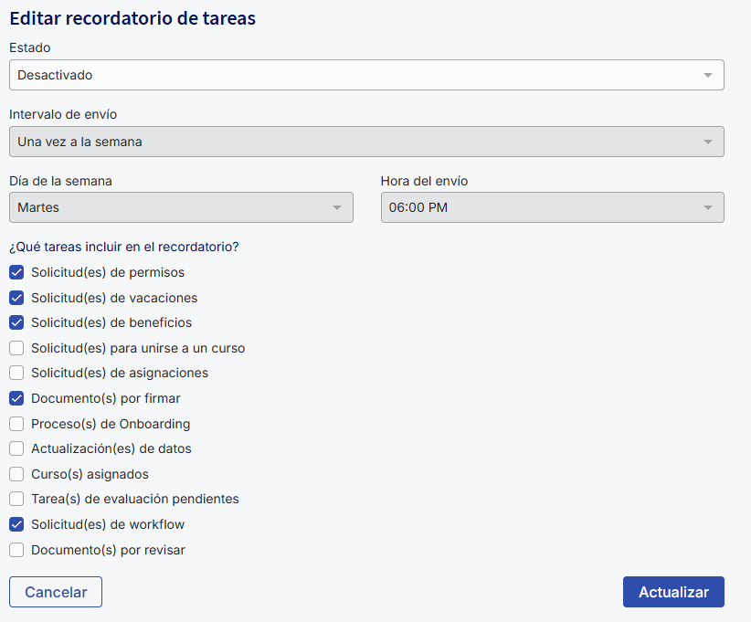 Importante: actualmente no es posible configurar el día, la hora ni el intervalo de envío del correo. El sistema envía este recordatorio semanal automáticamente con una configuración predeterminada.