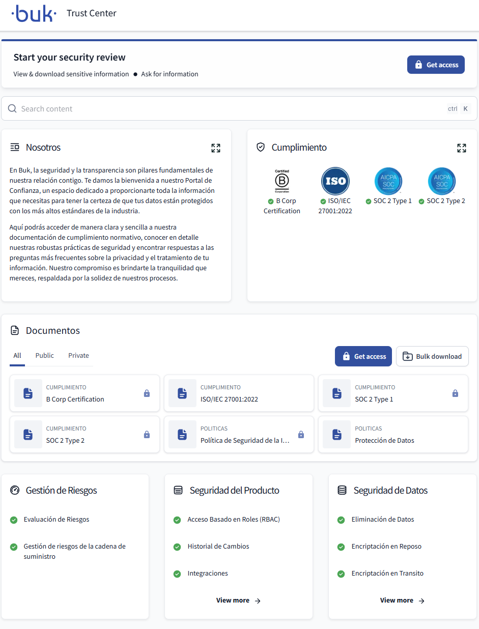 El Trust Center (https://trust.buk.cl) es el portal oficial de seguridad de Buk. Está pensado para que puedas consultar, descargar y solicitar información relacionada con nuestras prácticas de seguridad, cumplimiento normativo y protección de datos, de forma rápida y transparente.