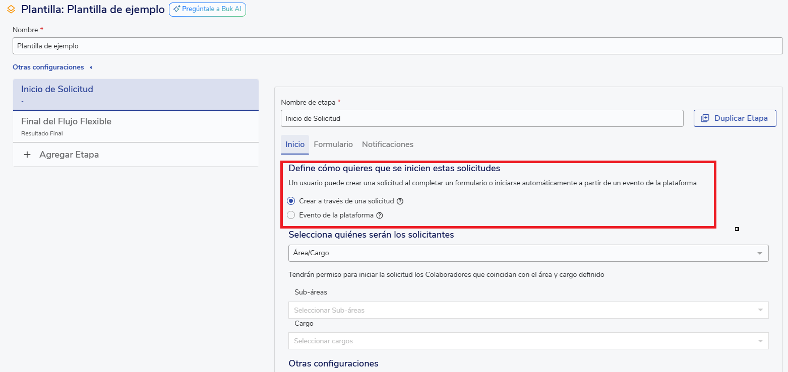 Cuando seleccionas “Evento de la plataforma”, la solicitud se iniciará automáticamente cuando ocurra el evento seleccionado.