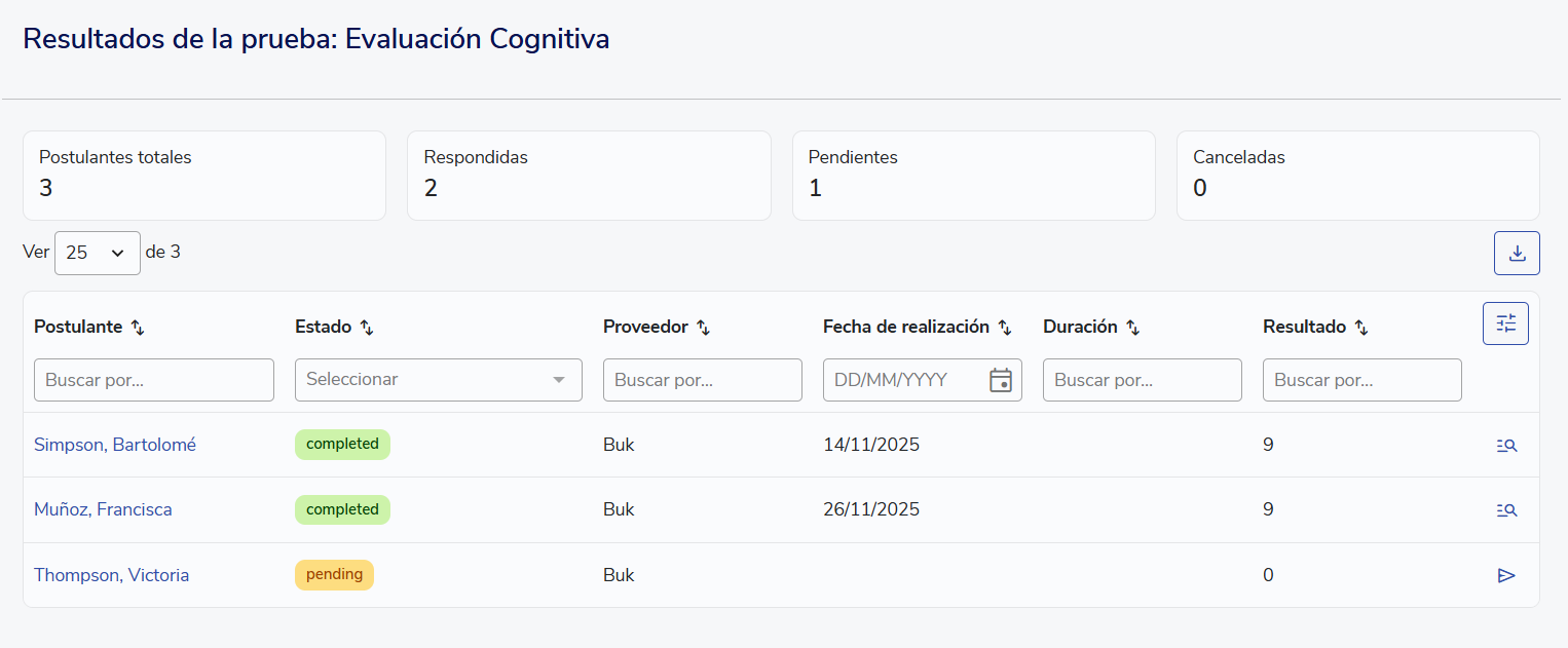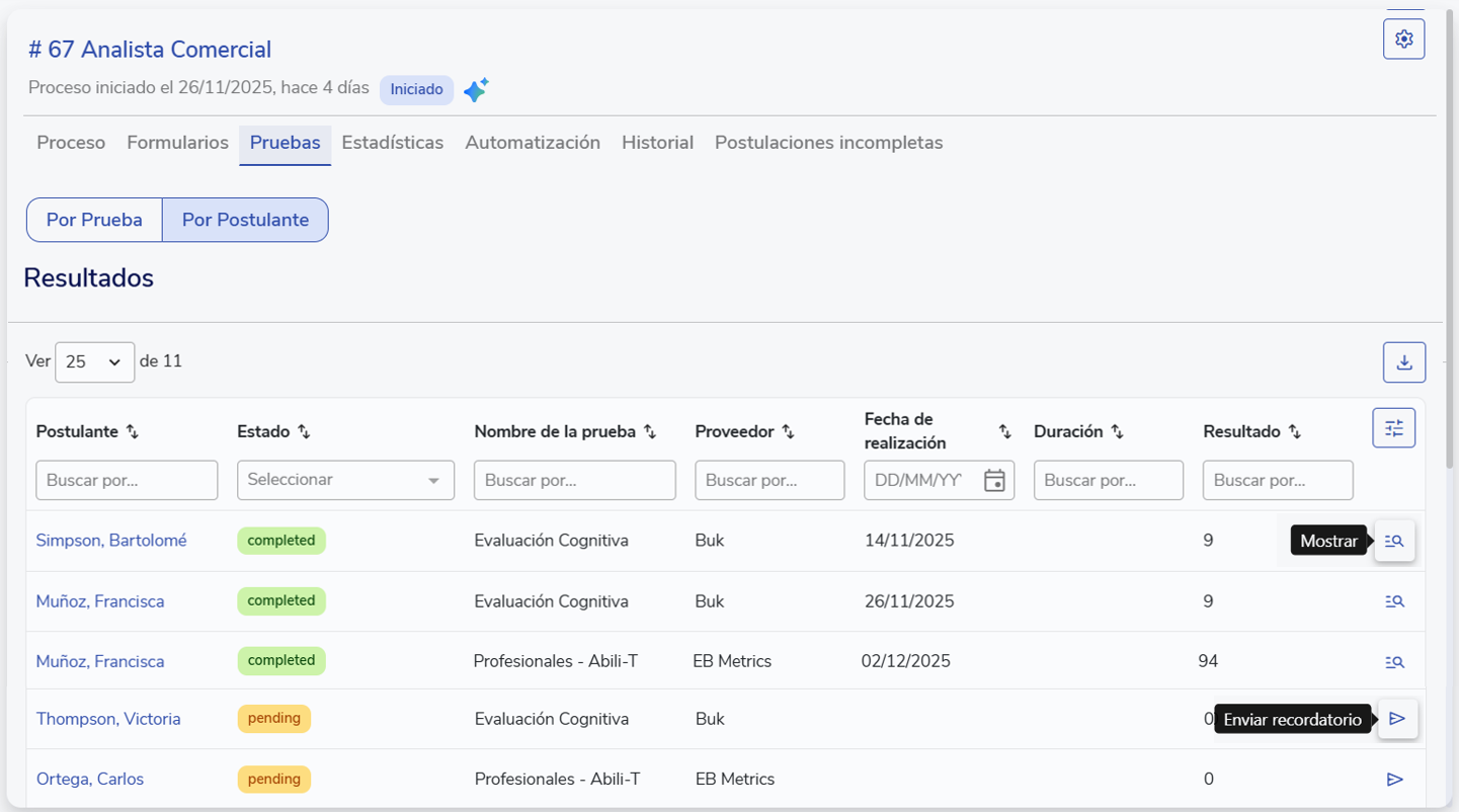En esta tabla encontrarás información relevante como el estado de la evaluación, el nombre del test, el proveedor, la duración (si aplica) y el resultado numérico obtenido. Al igual que en la vista anterior, podrás enviar recordatorios directos o entrar a ver el detalle de los resultados de cada postulante.