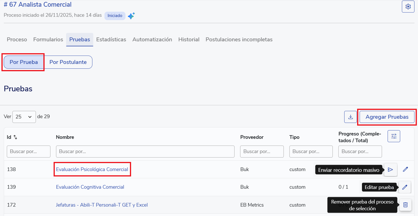 En la sección Por Prueba visualizarás el listado completo de las evaluaciones asociadas a tu proceso actual. La tabla principal te permite ver de un vistazo el nombre de la prueba, el proveedor y el progreso (cuántos candidatos han respondido sobre el total de envíos).