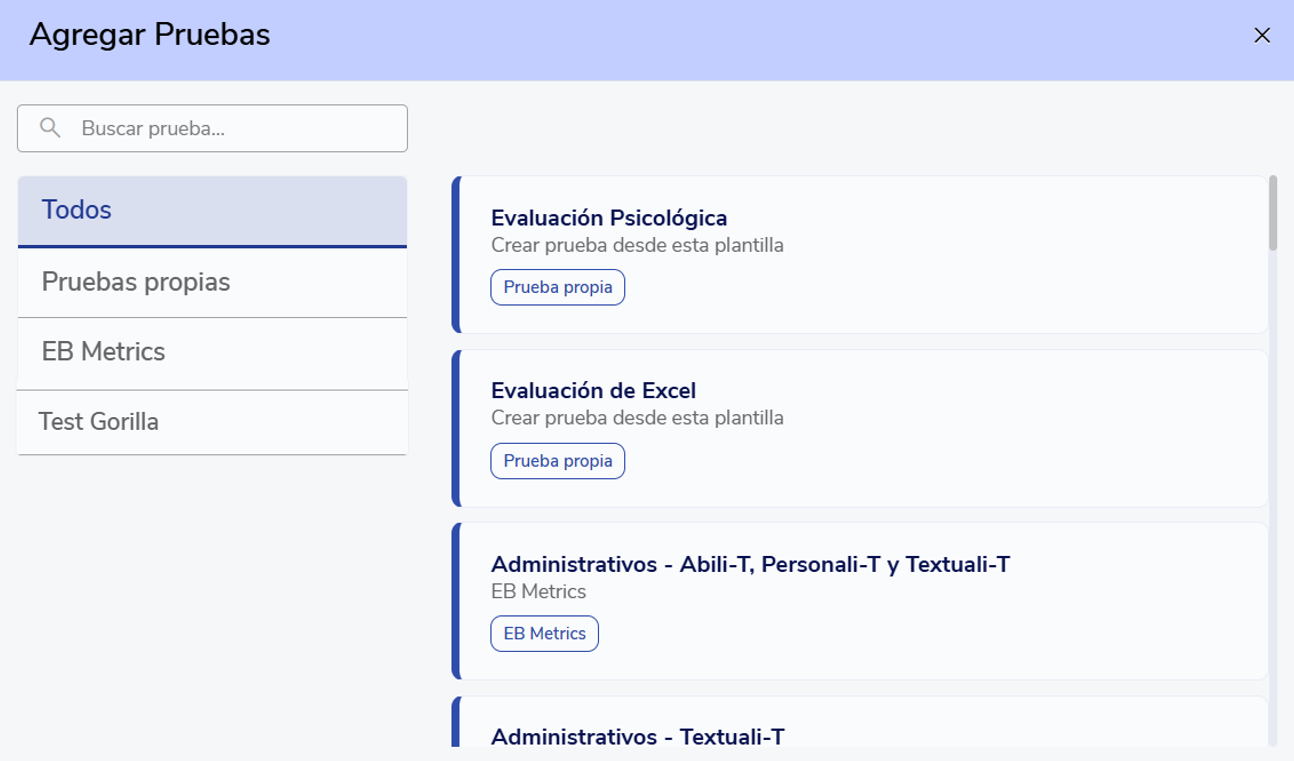 Pruebas de una integración: Si tienes activa la integración con proveedores como eb Metrics o Test Gorilla, sus catálogos aparecerán disponibles aquí.