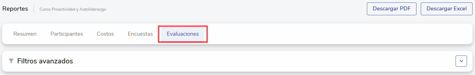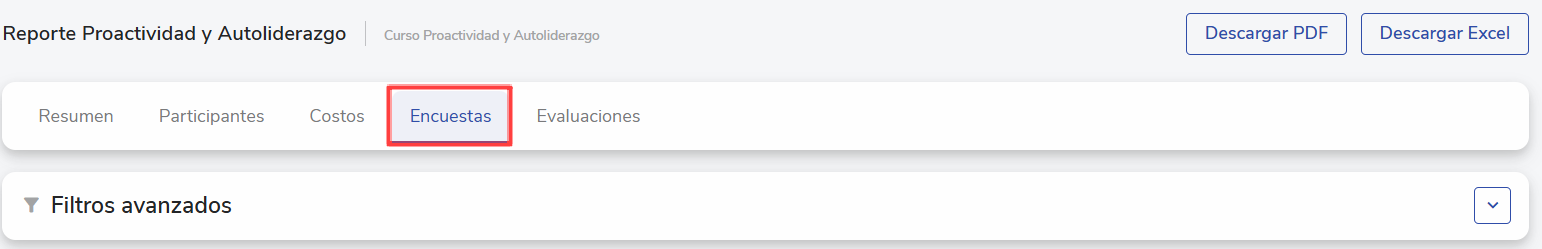 Esta funcionalidad aplica únicamente a los reportes generados desde el módulo Cursos E-Learning, y requiere que los cursos cuenten con encuestas o evaluaciones activas para mostrar datos.