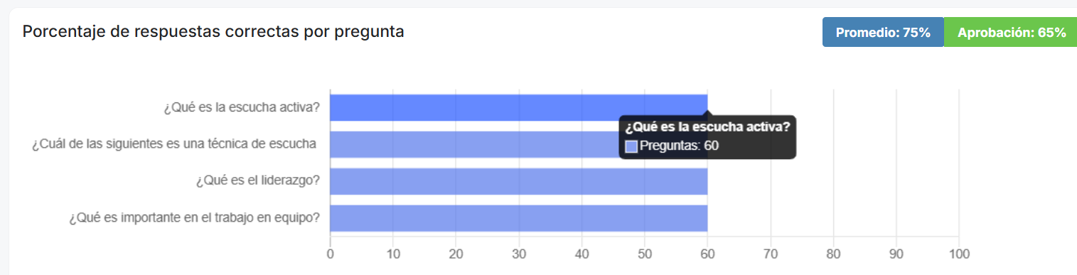 Fórmula: (Total de respuestas correctas de esa pregunta/Total de respuestas completadas) x 100