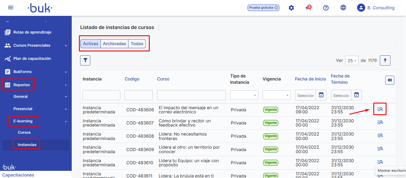 - A continuación, se mostrará el listado de todas las instancias de cursos e-learning. Por defecto, se mostrarán solo las instancias activas.
