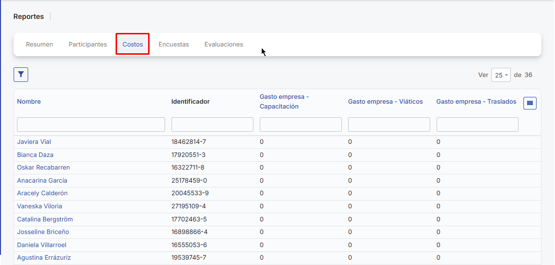 💰 Costos: Muestra los costos configurados en la instancia para cada participante: