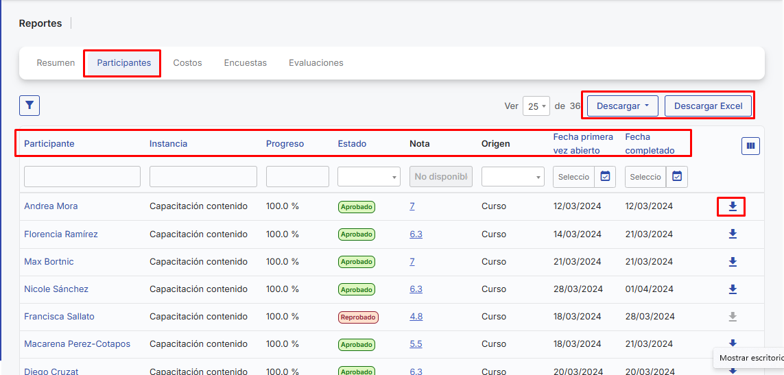 Este artículo tiene como objetivo guiar a los usuarios con rol súper administrador o administrador en el acceso, visualización y descarga de reportes de instancias de cursos e-learning. A través de esta guía se explican las secciones disponibles —como resumen de la instancia, participantes, costos, encuestas, evaluaciones y webinars—, así como los formatos de descarga que permiten gestionar eficazmente la información relacionada a la formación virtual.