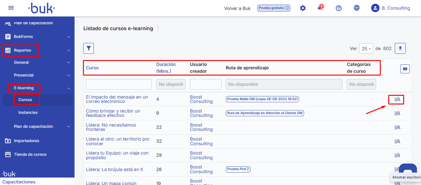 Aparecerá un listado de todos los cursos e-learning de tu plataforma. Este listado incluye: