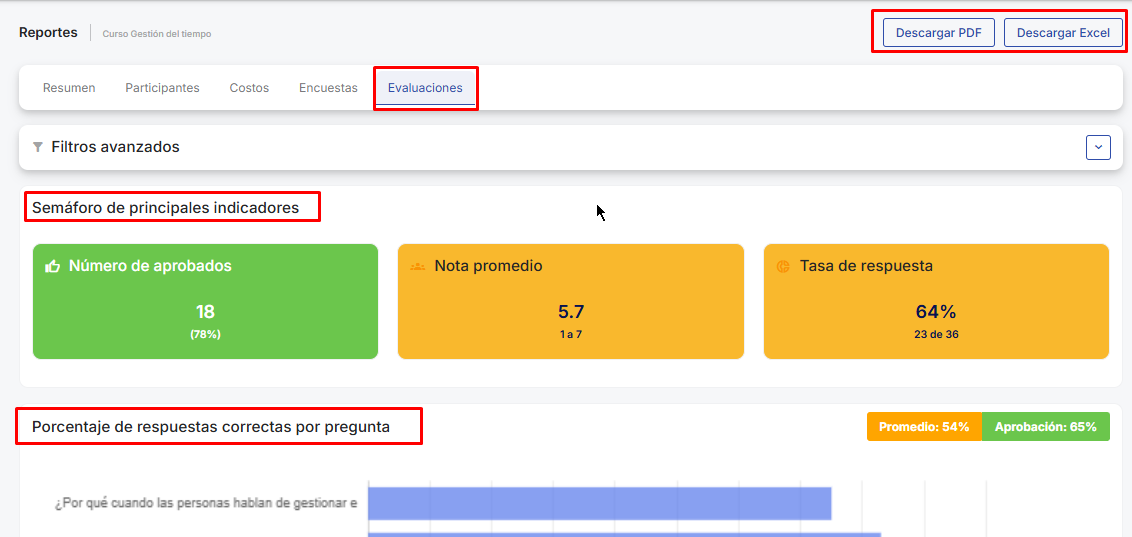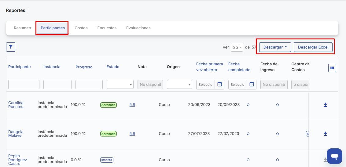 📌 Importante: Al descargar el reporte en Excel desde esta pestaña, el documento contendrá un consolidado de toda la información del curso y cada una de las secciones del reporte se encontrará en una hoja distinta. Por otro lado, si se descarga un reporte desde cada sección, como participantes o instancias, este incluirá sólo esa información.
