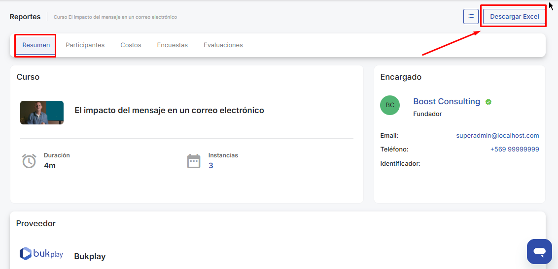 Este artículo tiene como propósito guiar a los usuarios con rol súper administrador y administrador en el acceso, visualización y descarga de reportes de cursos e-learning. A través de esta guía se explican las secciones disponibles —como resumen del curso, participantes, costos, encuestas, evaluaciones y webinars— así como los filtros y formatos de descarga (Excel o PDF) disponibles para facilitar la gestión de información.