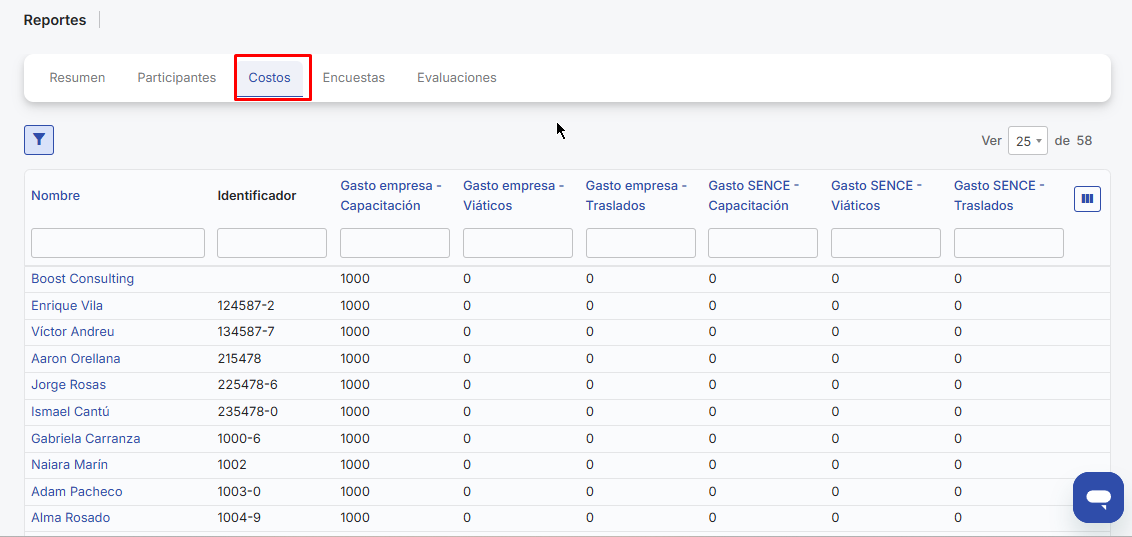 💰 Costos: Se muestra un desglose de los costos asociados por participante: