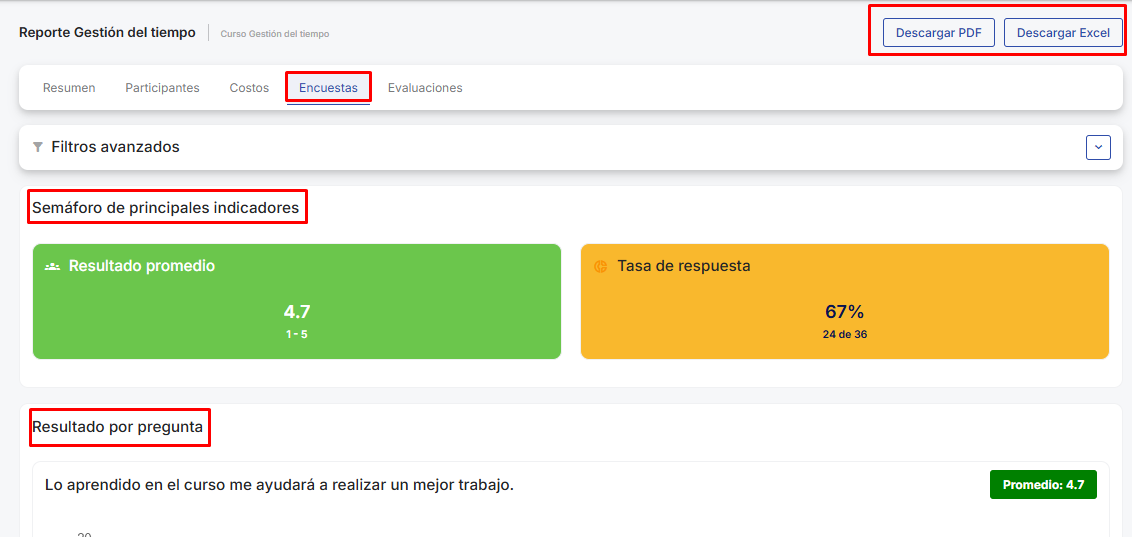 ⬇️ Descargas disponibles: Puedes descargar esta información como PDF (con gráfico de indicadores y resultados visuales) o como excel (con respuestas detalladas por participante).