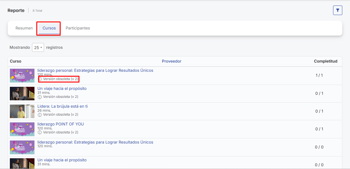 - Cursos marcados como "versión obsoleta" si ya no están vigentes