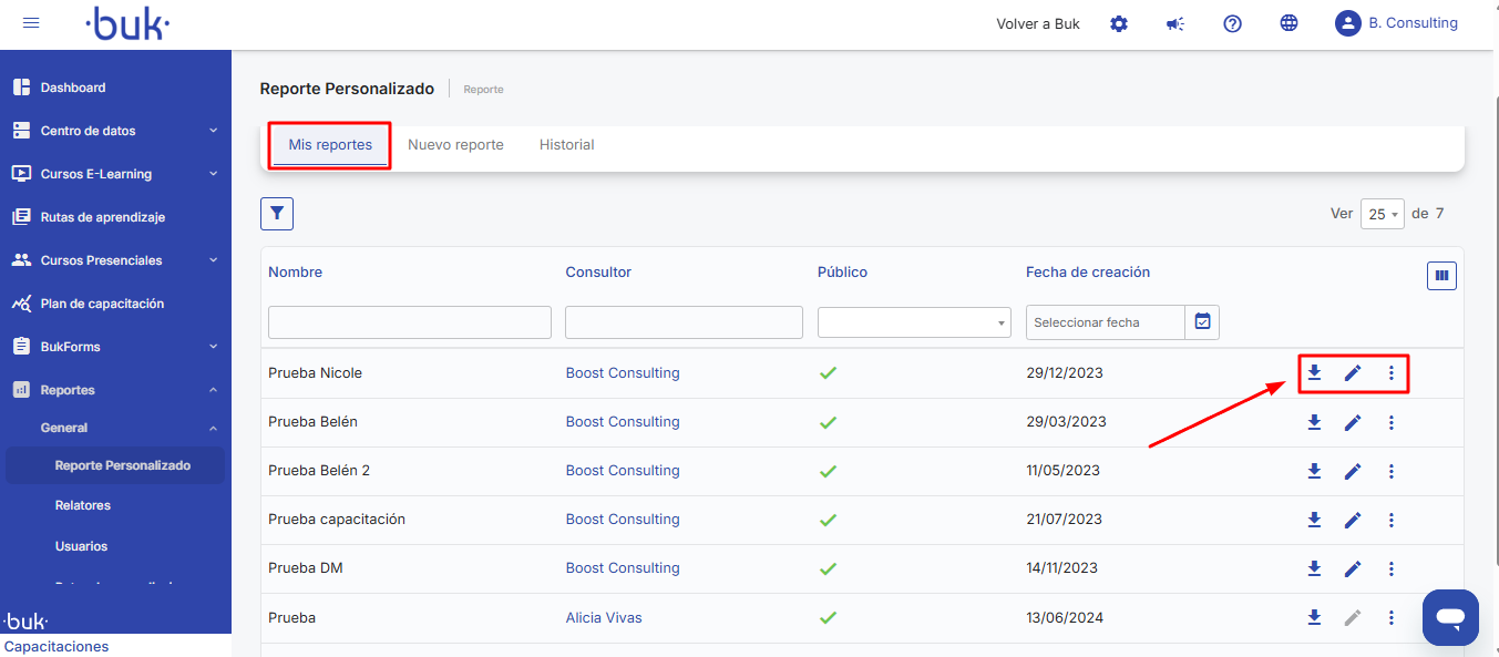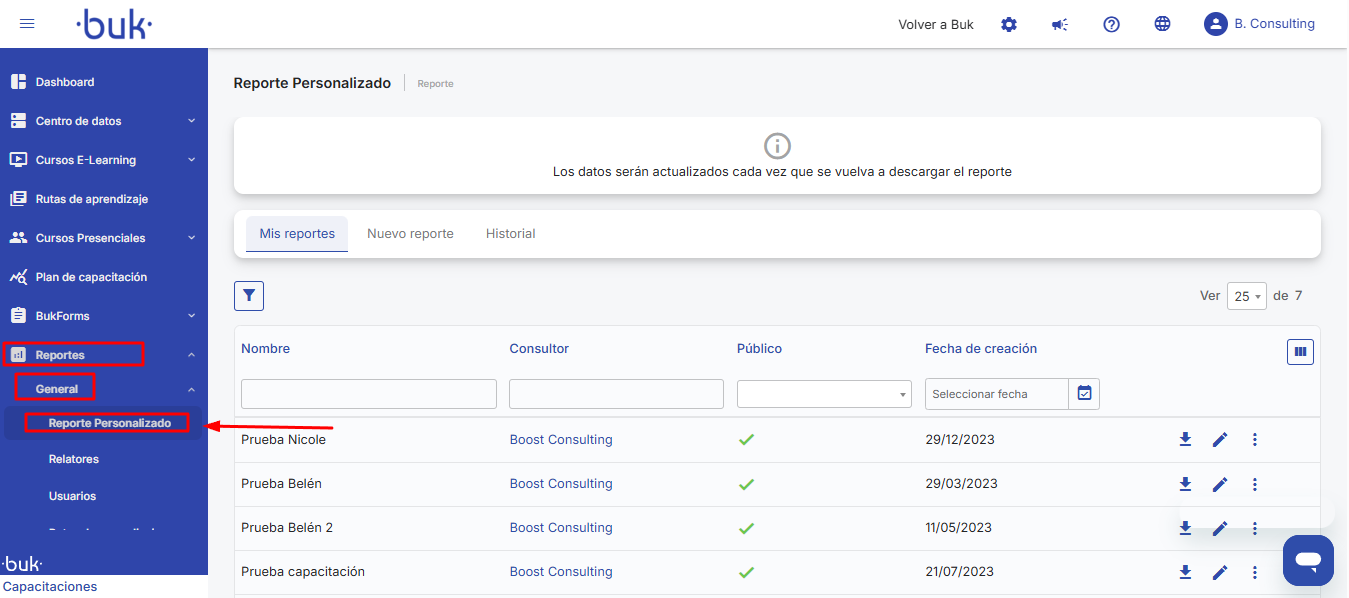 En esta sección se mostrará un listado con todos los reportes personalizados que ya hayas creado y guardado. Desde aquí podrás: