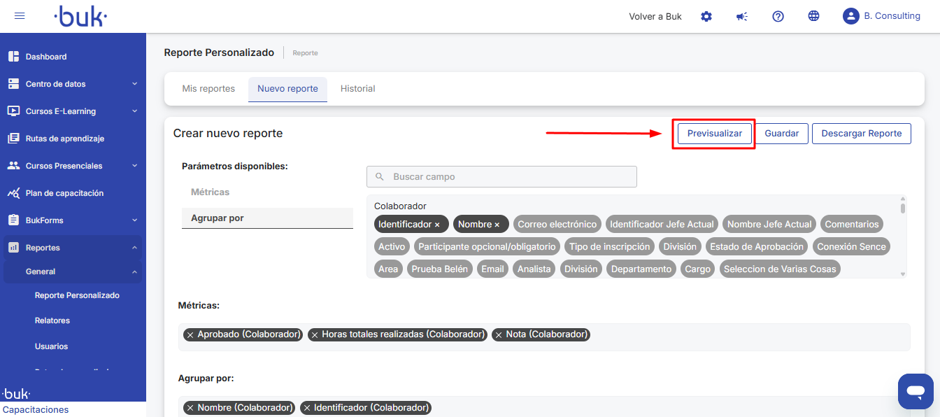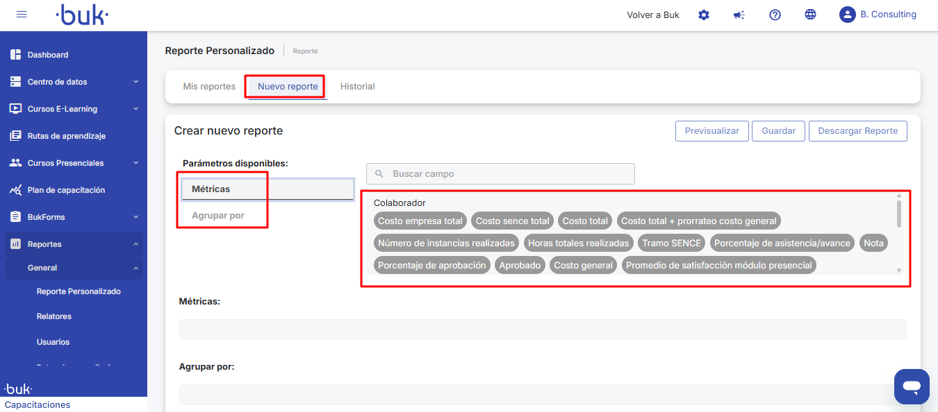 Corresponde a métricas cualitativas que pueden ser estándar de la plataforma (como nombre del colaborador, cargo, curso) o personalizadas mediante las categorías customizadas, aplicables tanto a colaboradores como a cursos y sobre los cuales se ordenará el reporte.