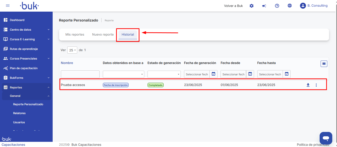 Por su parte, la pestaña “Historial” permite llevar un control detallado de todas las veces que has generado un reporte guardado y hacer seguimiento al proceso de descarga de los mismos.
