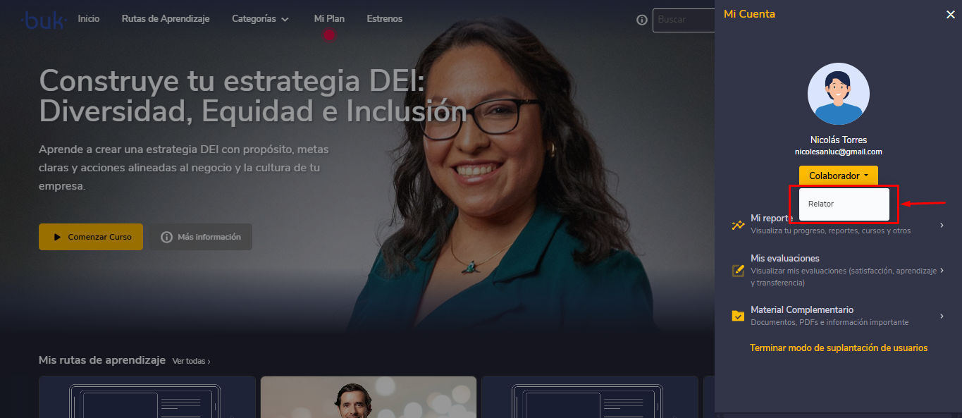 Si el relator es un colaborador interno, es decir, está registrado en la plataforma como colaborador y fue inscrito en un curso como host, deberá: