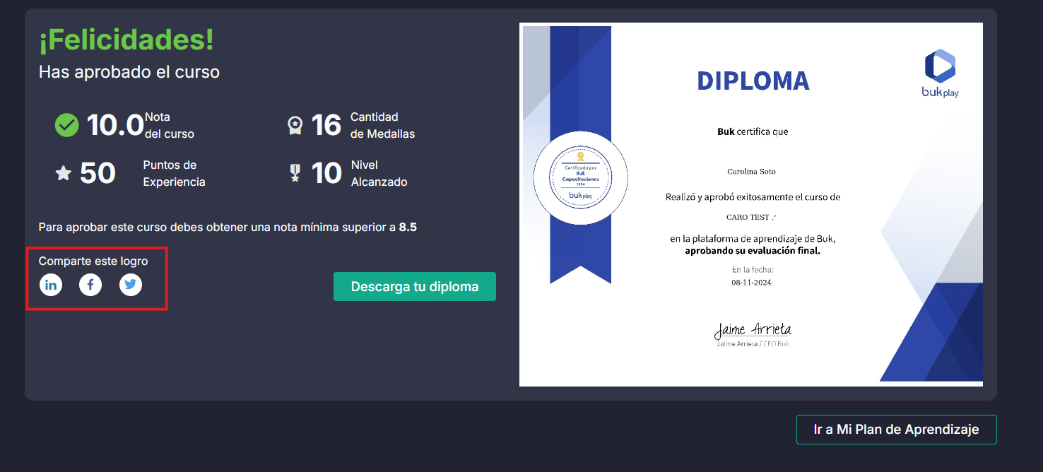 - Al finalizar el curso, se mostrará el diploma obtenido y las opciones de redes sociales disponibles.