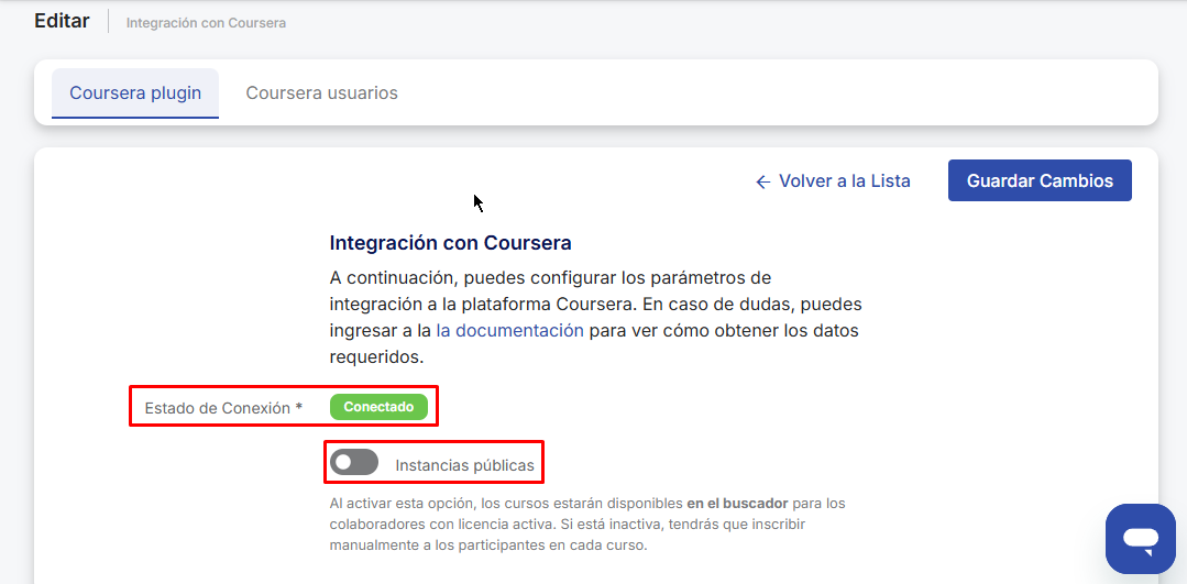 Además, puedes activar el switch “Instancias públicas”, lo que permitirá que todos los cursos de Coursera estén disponibles en el buscador para los colaboradores con licencia activa.