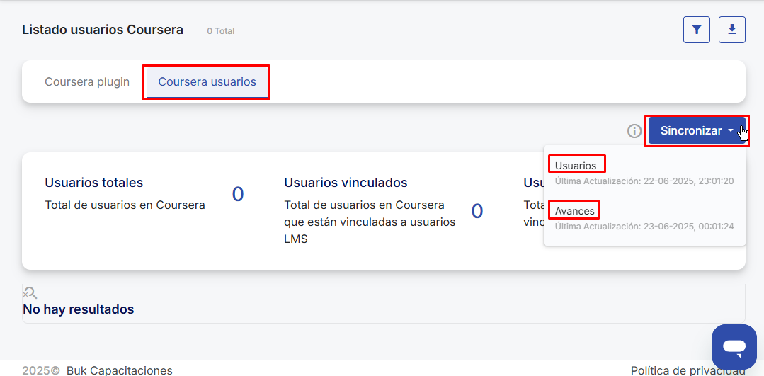 - Sincronizar usuarios: si aún no visualizas a tus colaboradores con licencia activa de Coursera en el LMS, puedes forzar esta sincronización.