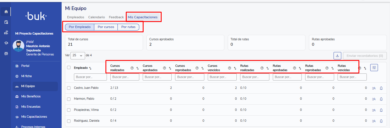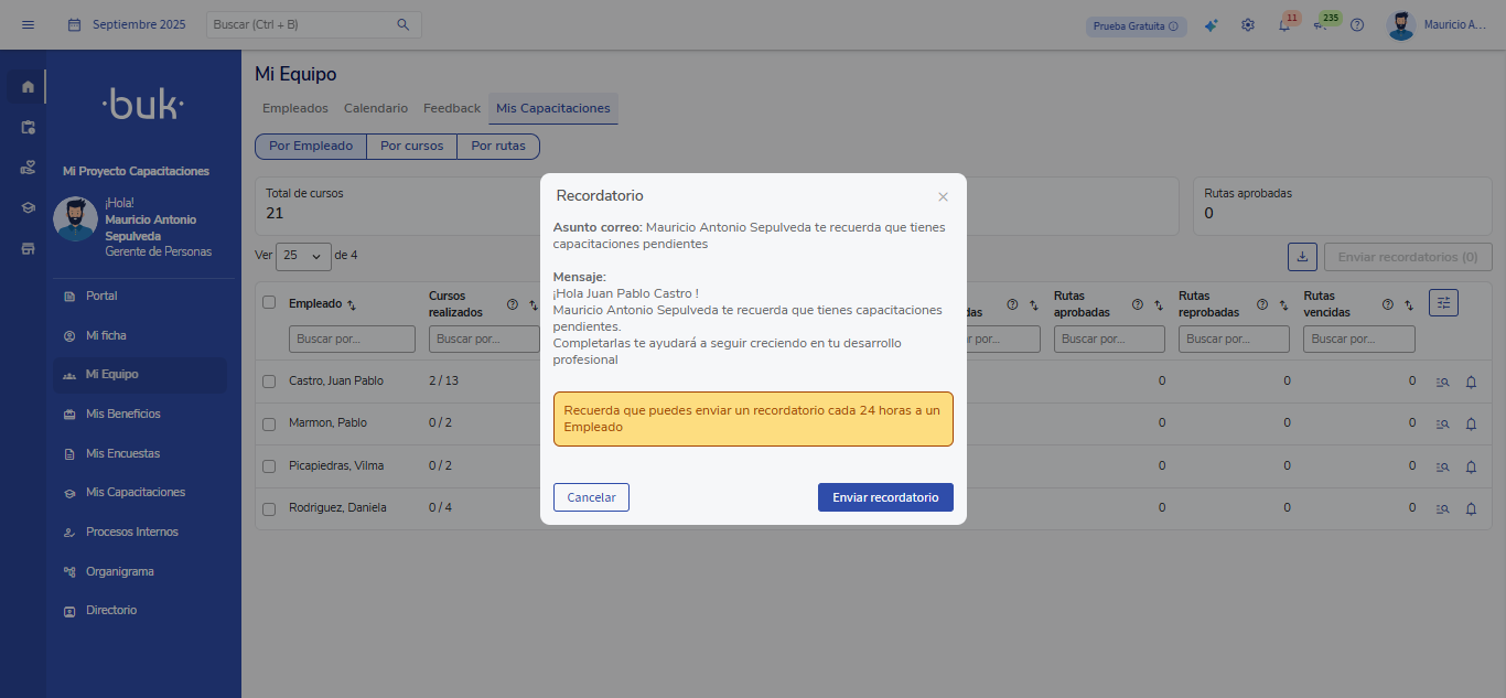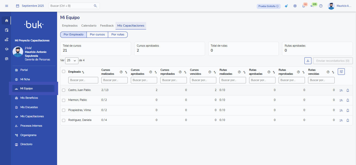 Este artículo tiene como propósito guiar a las jefaturas en el uso de la sección “Mi Equipo” (Capacitaciones), desde donde podrán hacer seguimiento al avance de capacitaciones de sus equipos, visualizar rutas de aprendizaje y cursos en los que están inscritos sus colaboradores, y enviar recordatorios para fomentar la finalización de estos. Esta funcionalidad está disponible exclusivamente para jefaturas con permisos asignados en Buk, y permite ver únicamente a los colaboradores asociados a su unidad organizacional; no contempla acciones de inscripción ni edición de cursos desde esta vista.