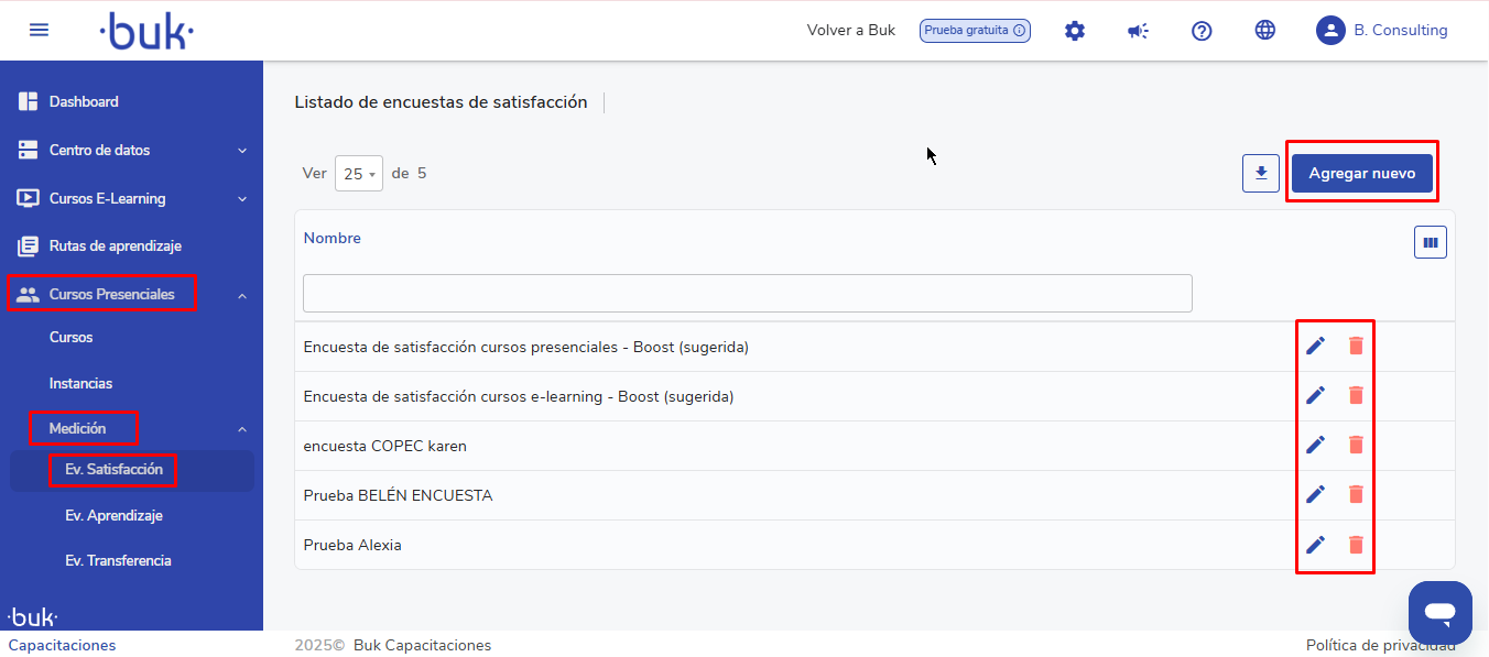 - Desde el menú lateral izquierdo, dirígete a Cursos Presenciales, selecciona Medición, y haz clic en Ev Satisfacción.