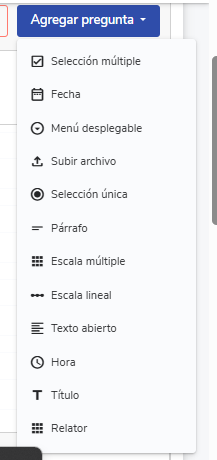 En el lado derecho encontrarás el botón Agregar pregunta, que te permitirá usar diferentes tipos de campos y formatos. Estos son los tipos de pregunta disponibles: