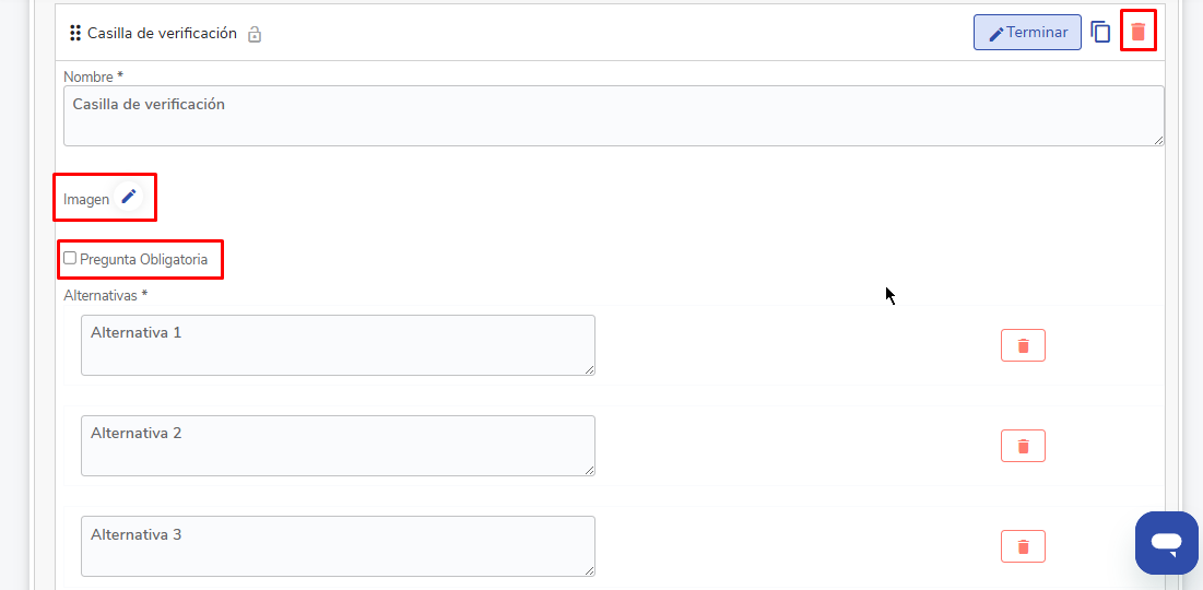- Registra las alternativas en caso de aplicar (según tipo de pregunta). Puedes eliminar y agregar nuevas.