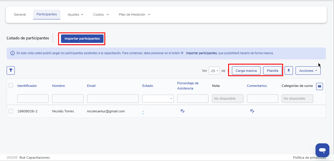 - Inscribir participantes manualmente: clic en Importar participantes y agrega su RUT. Luego puedes completar sus datos (estado, asistencia, comentarios).