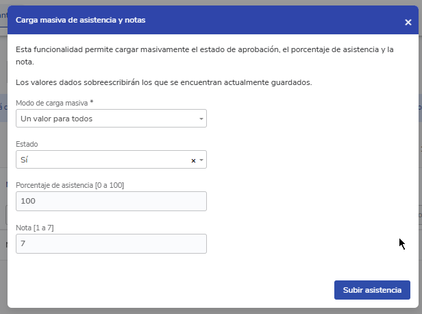 - Carga masiva de estado de aprobación, asistencia y nota: