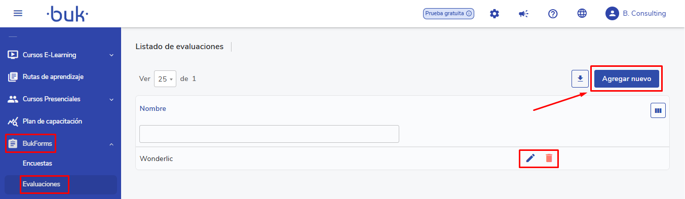 Desde BukForms, en el menú lateral, selecciona la opción Evaluación. Visualizarás el listado de evaluaciones creadas, las cuales puedes editar o eliminar.