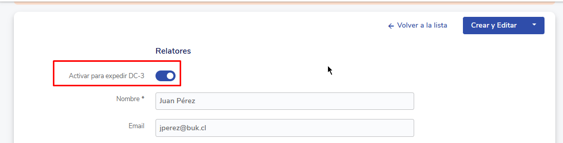 Si tienes activa esta integración, al crear o editar un relator podrás activar el switch "Activar para expedir DC-3". Al hacerlo: