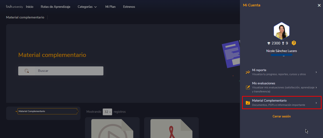 La sección Material Complementario permite cargar y administrar archivos que serán visibles de forma individual para los usuarios en su perfil, en una carpeta específica con el mismo nombre. Estos documentos no se utilizan como contenido para cursos e-learning, sino como recursos complementarios de consulta.