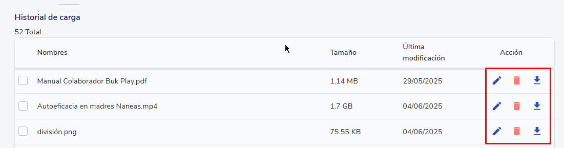 Una vez que el archivo ha sido subido, podrás gestionarlo desde el Historial de carga, donde se muestra la siguiente información: