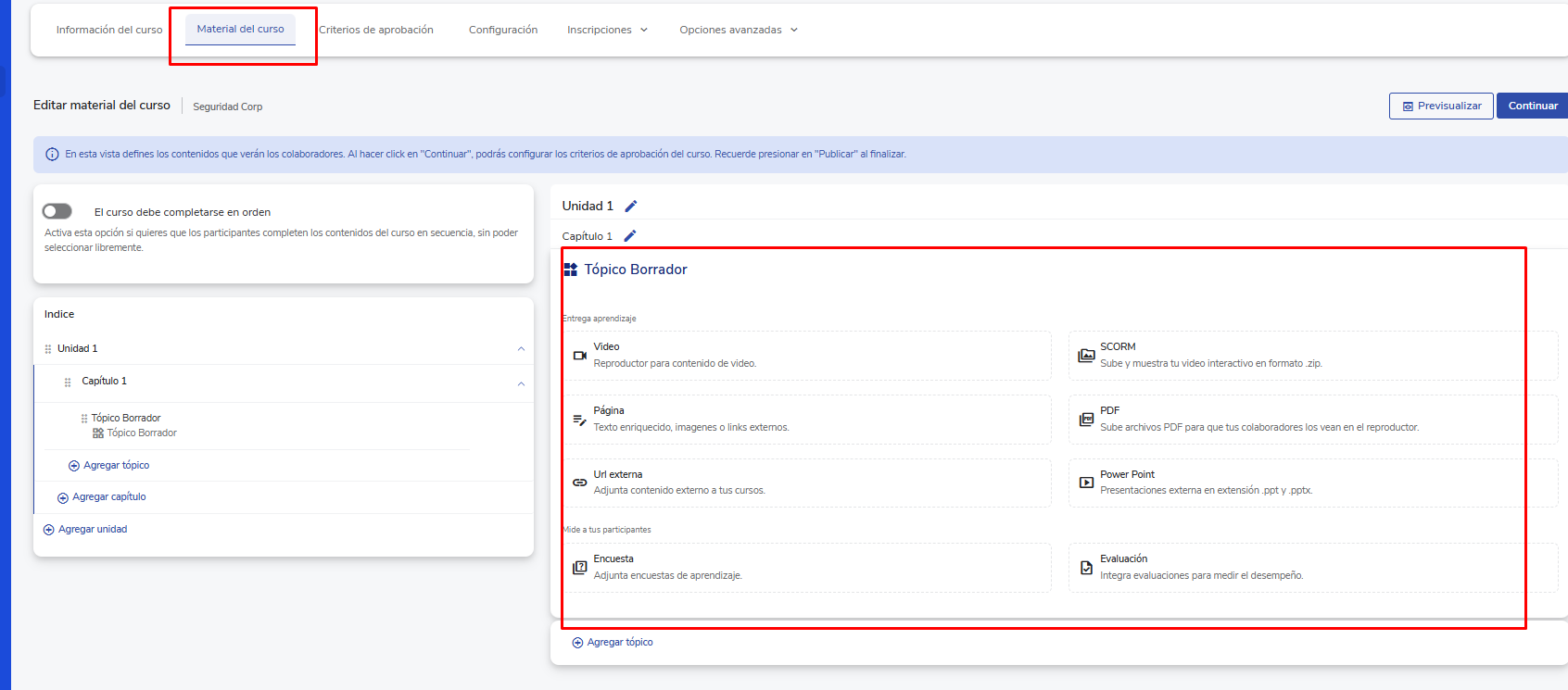 Nota: Para agregar materiales o archivos directamente a un curso , ingresa al curso correspondiente, selecciona la sección de material del curso y utiliza la opción 'Agregar archivo'. Desde ahí puedes cargar documentos, videos o presentaciones que estarán disponibles solo para los inscritos en ese curso