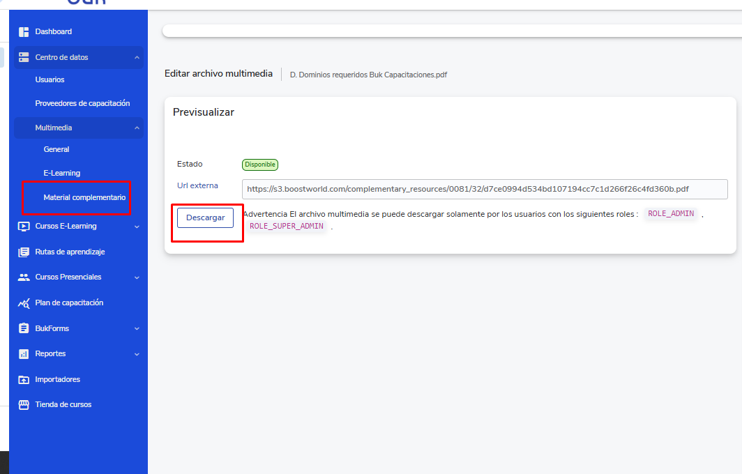 - Desde el menú lateral izquierdo, ingresa a Centro de datos, luego, Multimedia y haz clic en Material Complementario.